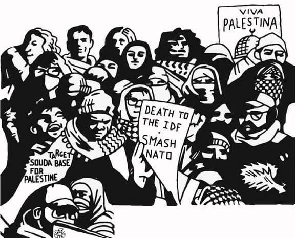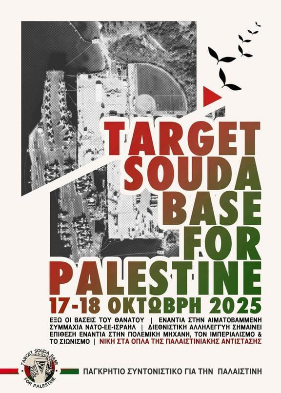 Here in Crete, after two years of determined struggle against this genocide, we have decided to act in coordinated fashion from all the island’s cities, and together with comrades in solidarity across the country, to target the enemy that stains its soil: the Souda military base. Its very existence and its use for supplying the Israeli war machine make us literally complicit in this genocide, while placing the safety of the local community and its broader ecosystem in direct danger. Thus, on 17 October 2025, we join our voices in a Cretan march in Chania, and on 18 October in a nationwide mobilization against the Souda military base ase and against the participation of the Greek state in the genocide of the Palestinian People. Crete, a timeless symbol of struggles, will be called to become one more tile in the mosaic of the global movement of internationalist solidarity with the Palestinian people. A movement that, through initiatives such as BDS, Palestine Action, the Global Sumud Flotilla, and others, seeks to build a popular bulwark against the designs of the butchers of today’s world.